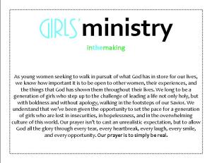 Every week for the next few weeks a group of girls and myself will be taking trips to deliver this card to other women in ministry. We are so excited to see how God will use their experiences, heart breaks, advice and love to lead us. We’ve already had some excellent feedback. We come on our knees and expecting God to do great things.